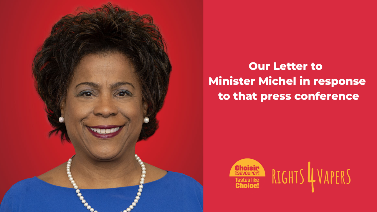 Dear Minister Michel, I am writing to you today to address the theatrical performance that was held in the West Block on Friday, by government-funded tobacco control leaders where they made claims that 50,000 high school students have started vaping since you took office and uses that figure to call for a national ban on